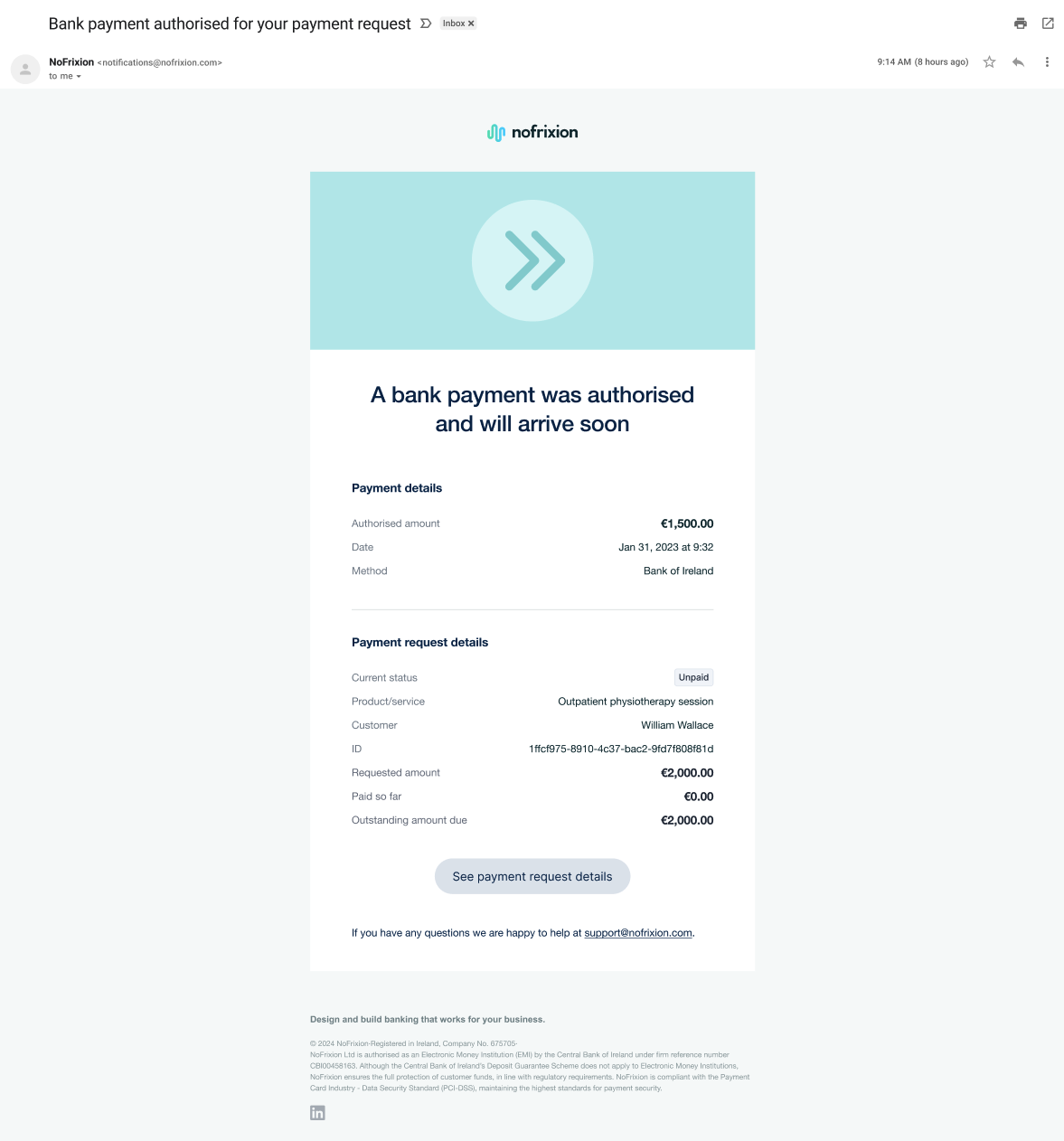 Description: This email notifies relevant users that a payer has authorised a payment from their bank. While the authorisation is complete, the funds have not yet arrived in the recipient’s account. A separate email will be sent once the payment has settled.