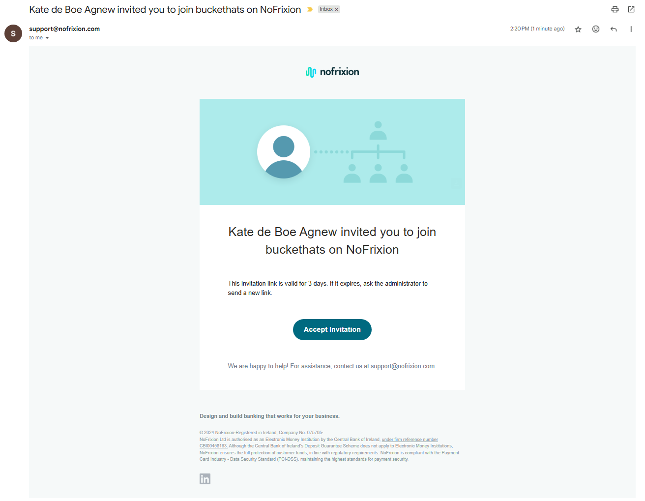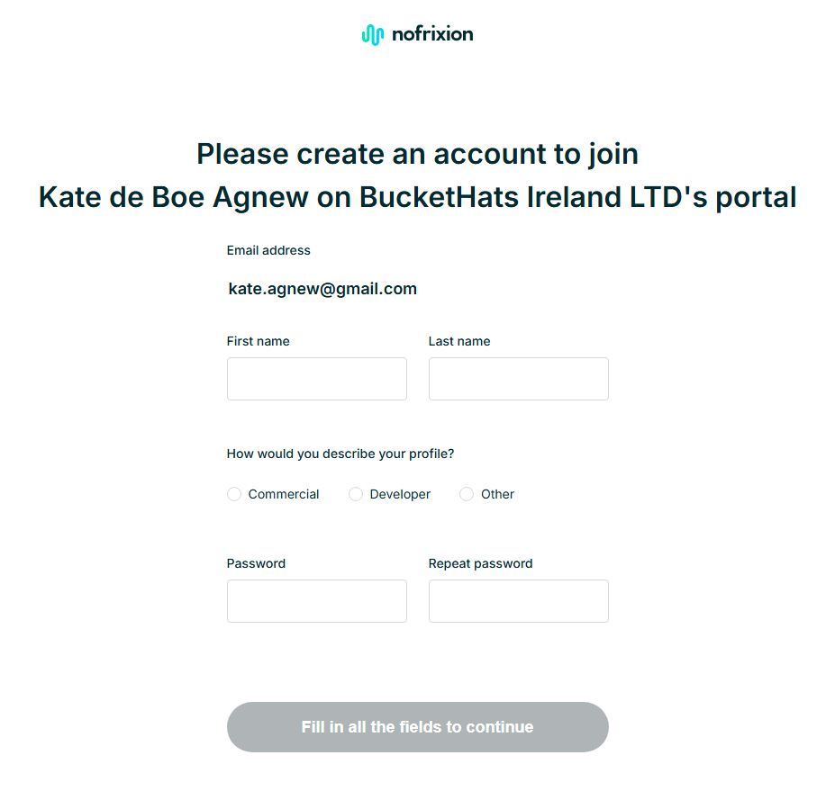 Once you have been invited by a user, you will receive an email from support@nofrixion.com which will bring you to the portal to create your account.