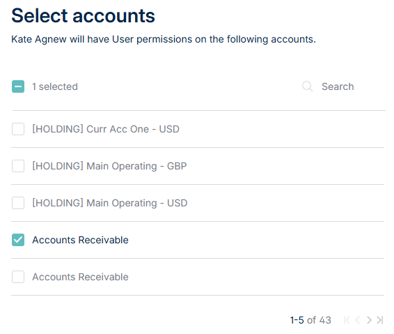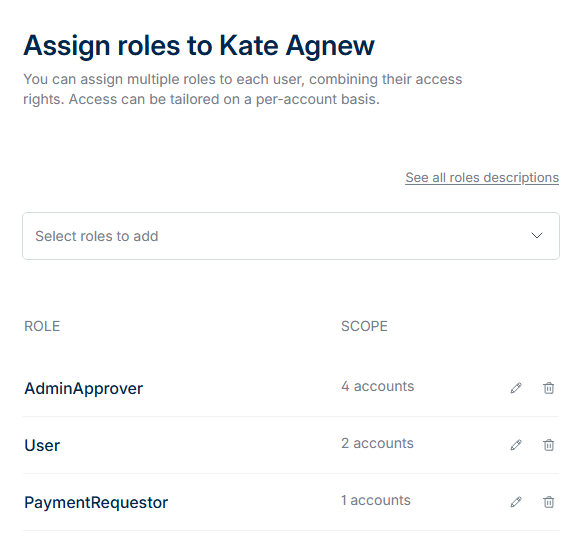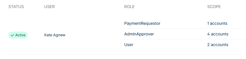 - Now you can see a breakdown of the roles and their scope (i.e., the number of accounts selected) under the user. Remember that roles aggregate if assigned to the same payment account. If everything looks correct, click Assign Roles at the bottom of the sidebar.