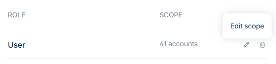 - Click on the pencil icon beside the role and scope to edit the scope of the role that's assigned to the user. In the screenshot below, the User role is assigned to 41 accounts across the merchant: