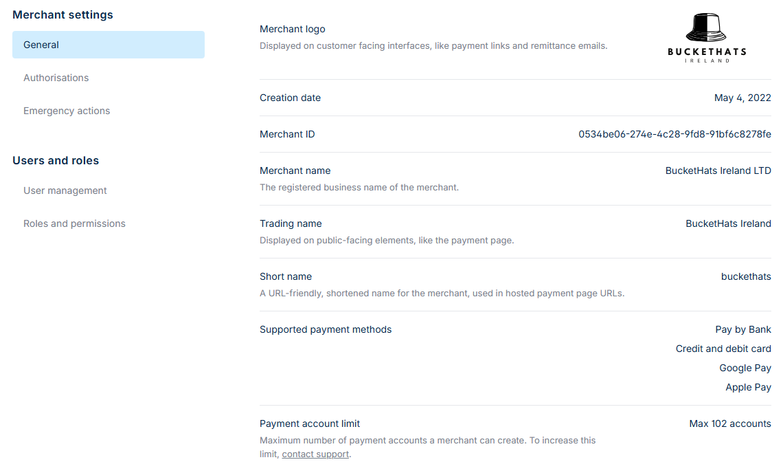 Under the General tab, you'll be able to review the details about your merchant. Here you'll see: