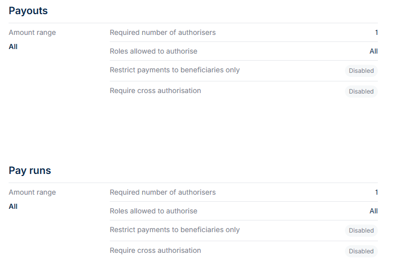 - Roles allowed to authorise - see which roles can authorise a payment.
