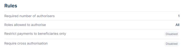 - Required number of authorisers - see how many users are required to authorise an amount (there is no limit).