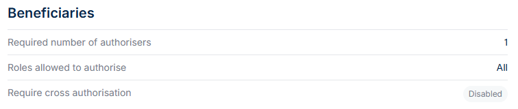 - Required number of authorisers - see how many users are required to authorise a beneficiary (there is no limit).