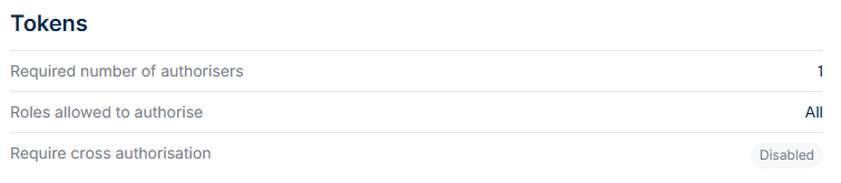 - Required number of authorisers - see how many users are required to authorise a token (there is no limit).