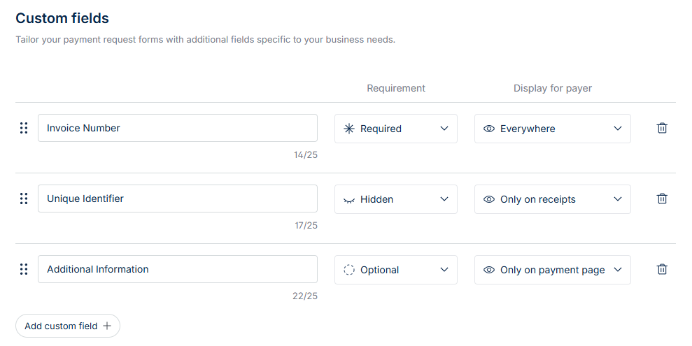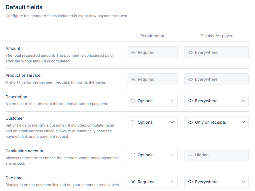 Default fields are the standard fields included in every new payment request. Some fields are required, while others are optional depending on your setup. You can also decide where each field is displayed, i.e., on the payment link, receipts, or kept hidden.