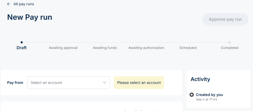 At this stage, the pay run is still in preparation and cannot progress until an account has been selected to fund the payments. If your pay run includes payments in multiple currencies, you'll need to select a source account for each currency.