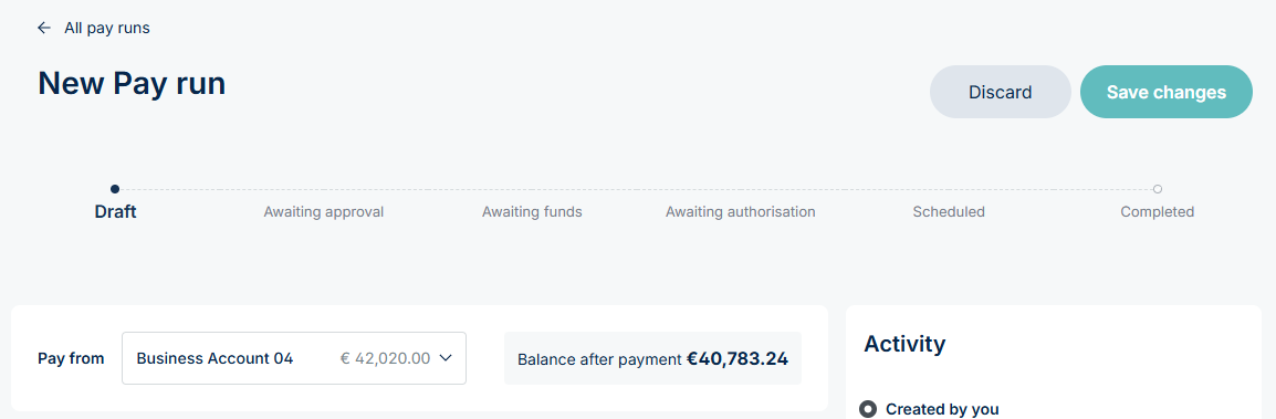When the pay run has been processed and all payments have been executed, the status will automatically update to Completed, indicating that the pay run is finished.