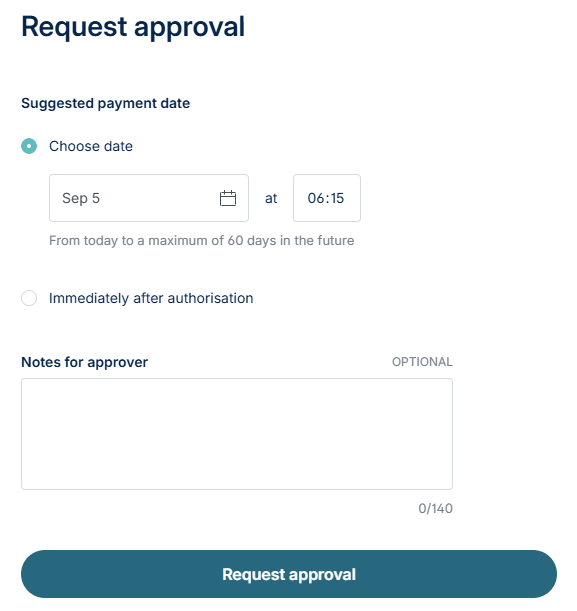 - Set the payment schedule → Choose a specific date and time for the payouts to be sent, or select Immediately after authorisation to release them as soon as they’re authorised.
