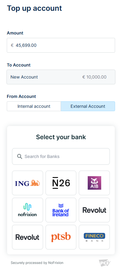 The external top up allows you to complete a payment via Pay by Bank, meaning if you have access to your customer’s traditional bank account, you’ll be brought to the relevant bank’s portal to complete the transfer.
