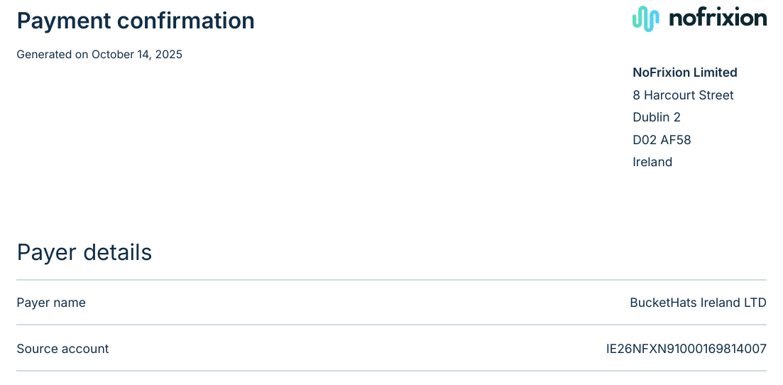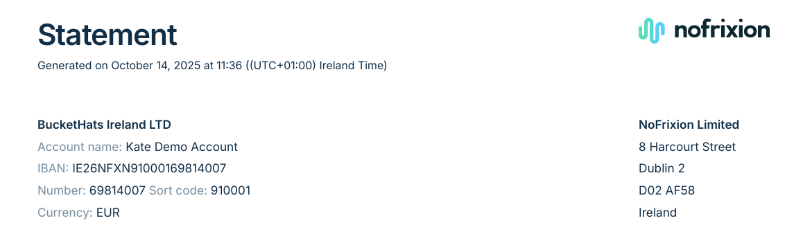 For example, the merchant account name ‘BucketHats Ireland LTD’ appears on the NoFrixion statement, with the payment account name displayed underneath ('Kate Demo Account'):