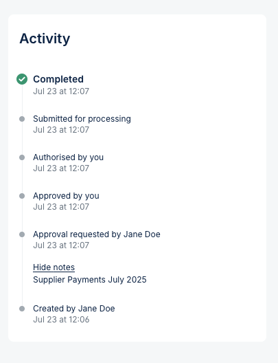 Each pay run includes a detailed activity log that records all user actions throughout its lifecycle. This log shows: