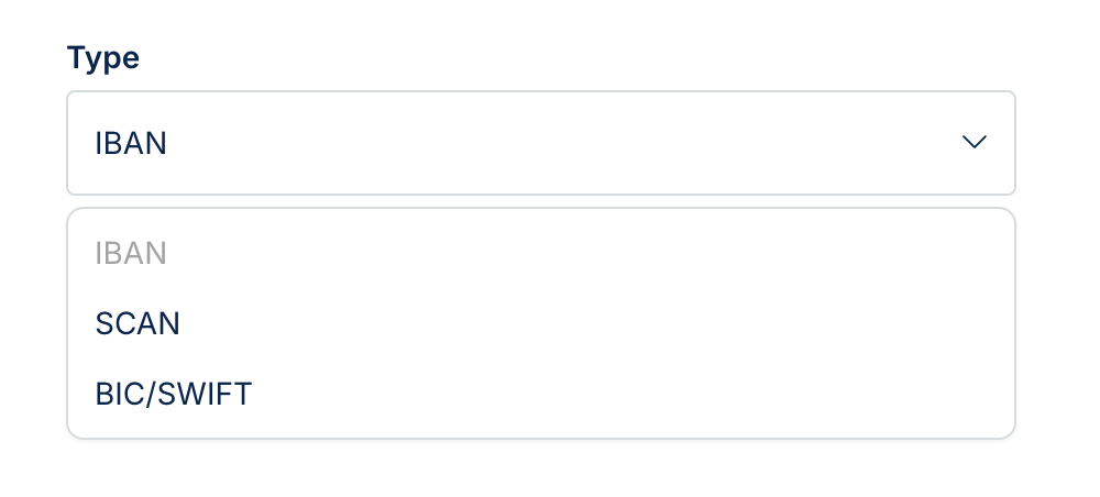 - IBAN: For accounts in Europe or any region that uses IBANs (ideal for SEPA and EUR payments).
