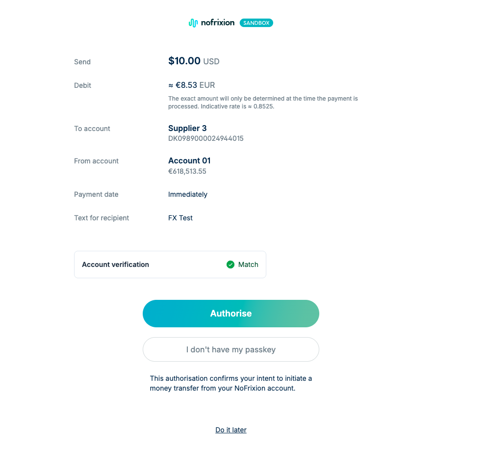 On the Authorisation page you will be able to review the FX rate. Once you're to proceed click Authorise.