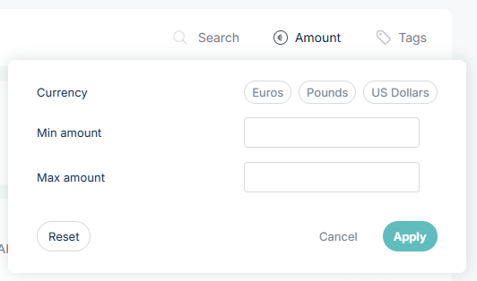 Use the filters on the transactions table to refine your data. You can filter by date, amount, or other available criteria to include only the relevant transactions.