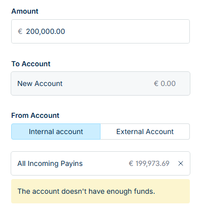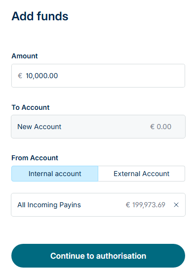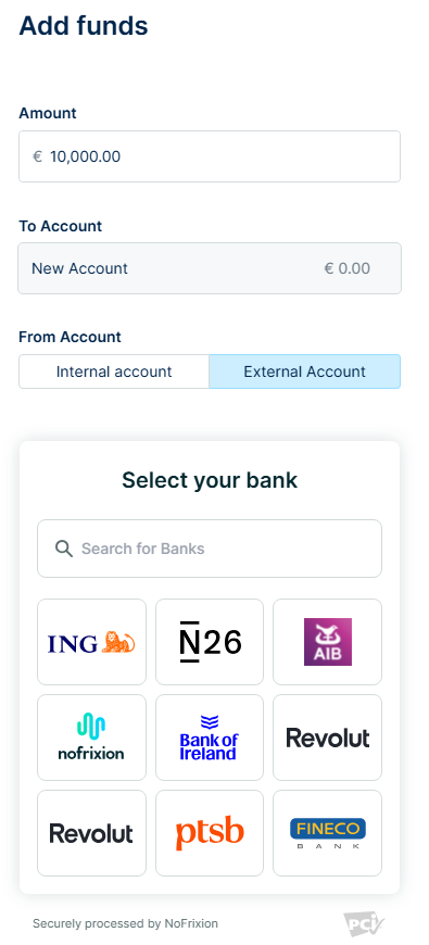 You can add funds to your account by transferring funds internally from another NoFrixion account, or via Pay by Bank, which will initiate a bank transfer from your traditional bank account to your NoFrixion account.
