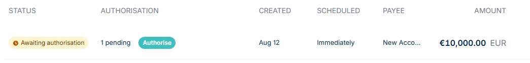 After clicking Continue to authorisation, you'll be brought to an authorisation page with details on the transfer you wish to complete. Click Authorise to complete the transfer: