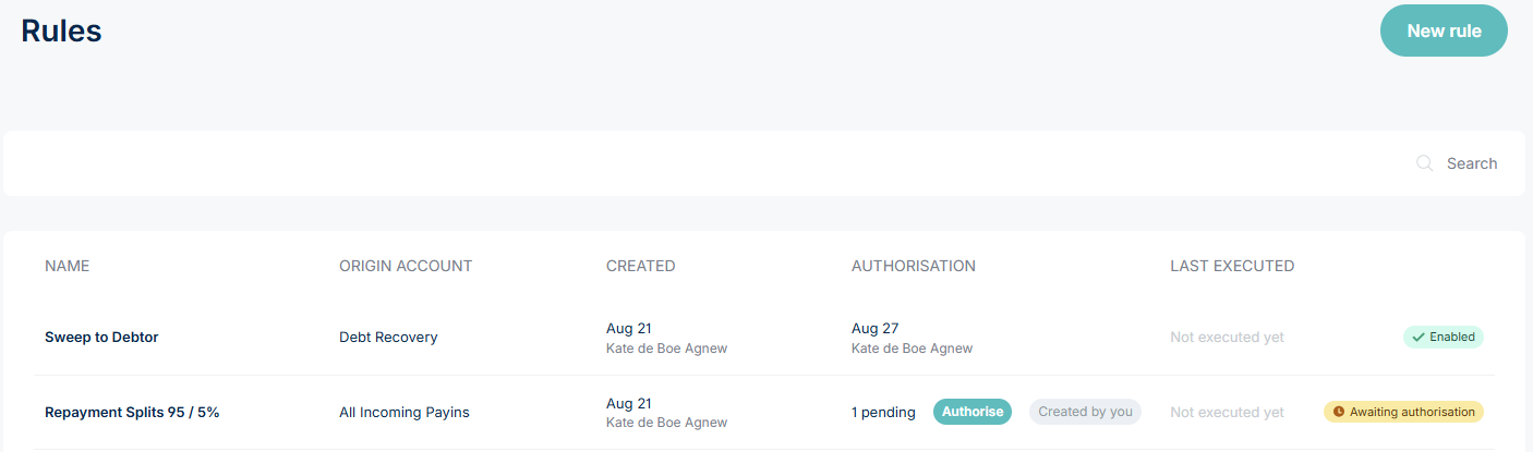 Immediately after clicking the Save for later authorisation button, a side panel will appear displaying the details of your new rule, indicating it is awaiting authorisation.