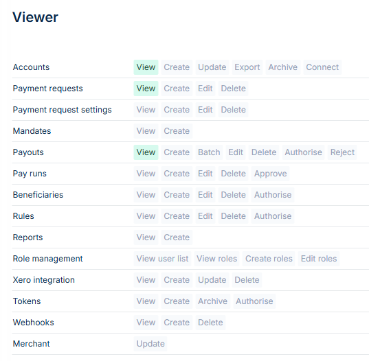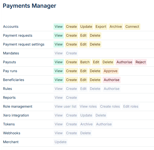 Whereas a role called “Payments Manager” might include additional permissions, like: