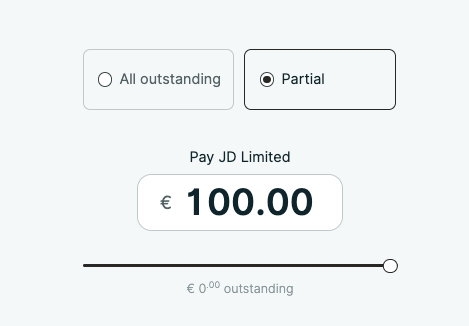 When partial payments are enabled, your customers will see the option to select Partial at the top of the hosted payment page, e.g.: