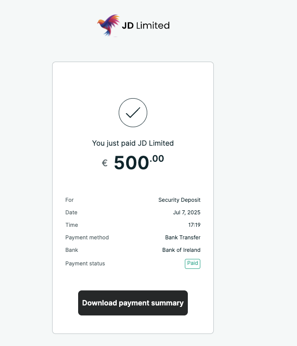 After a customer completes a payment using the payment link, they are shown a confirmation page. From this page, they have the option to download a payment summary for their records.