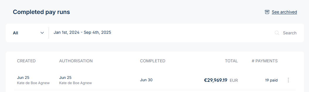 You can view archived pay runs by clicking the See archived link next to the Completed pay runs section: